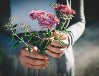 For example, to create a simple centerpiece, grab as much greenery as possible and put it in a vase filled with water. Don’t be afraid to fill the vessel with extra pieces of greenery to form a base. Keep all the elements no taller than the length of your elbow to the tips of your fingers.
